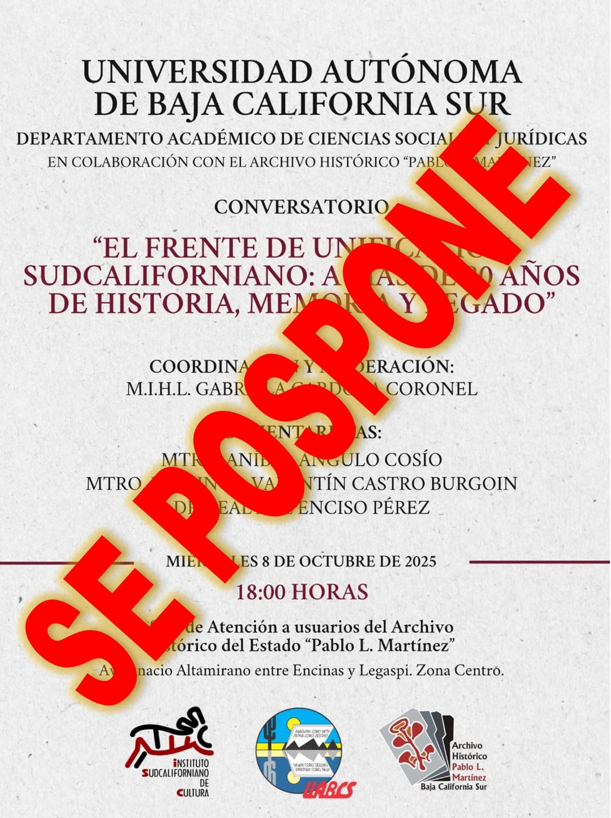 El Gobierno del Estado de Baja California Sur, el Instituto Sudcaliforniano de Cultura y el Archivo Histórico del Estado de Baja California Sur "Pablo L. Martínez", en coordinación con el Centro Cultural "Prof. Nestor Agúndez Martínez" de Todos Santos BCS, les invitan al conversatorio: